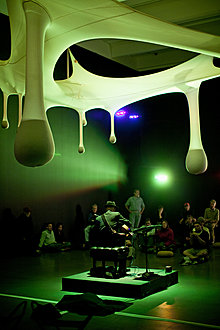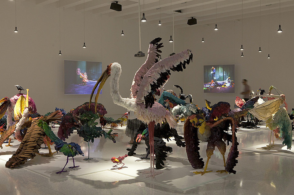 The Walker’s dedication to interdisciplinary programming continued, but it was especially visible in our work around Merce Cunningham. In October and November 2011, we hosted a 10-day celebration that included talks, workshops, exhibitions, and a final performance by the Merce Cunningham Dance Company (MCDC), which disbanded at the end of that year. A work by Jérôme Bel featured former Cunningham principal dancer Cédric Andrieux, while two shows drawn from our MCDC collection examined the legendary choreographer’s collaborations with artists Robert Rauschenberg and Ernesto Neto. To further animate these galleries, we hosted Sound Horizon performances, with musicians including Julianna Barwick and Elliott Sharp playing in the gallery beneath Ernesto Neto’s otherworldly installation otheranimal, which he created as décor for a Cunningham dance.