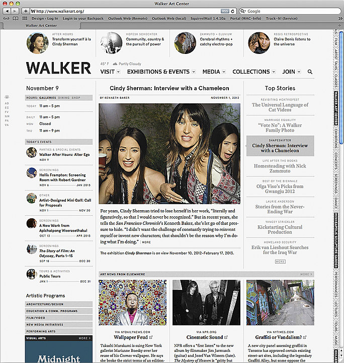 Finally, the year also saw the redesign of the Walker website, which drew an unprecedented 2.1 million visits in fiscal year 2011/2012, with more visitors coming from Minnesota and from locations around the world. Nearly 2 million more users visited our other sites, mnartists.org and artsconnected.org. With more than 4 million total visitors, our online destinations reflect our global reach. Launched in December 2011, the new website is an “idea hub,” which looks and functions like a news site, providing original content about the Walker and contemporary art as well as aggregated news, videos, tweets, and more. It was praised as “the website that every art museum will have to consider from this point forward” (Modern Art Notes), “a model for other institutions of all kinds” (The Atlantic), and an “earth-shaking game changer” (Artlog). It took home two prizes at Museums and the Web (Most Innovative, Best Overall) and was nominated for a 16th Annual Webby Award. The site complements the successes of the Walker’s print publishing, which created three new catalogues and received a number of prestigious awards, and our expanding social media endeavors, which saw Twitter followers jump nearly 100,000 to 330,000, Facebook fans increase to 59,000, and continued experimentation on other platforms such as Flickr, Tumblr, Pinterest, and Instagram.