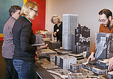 Our endeavors extended beyond our campus to the community at large. The Walker took a partnership role in a new initiative to reenvision and refresh downtown Minneapolis’ Hennepin Avenue as a lively and compelling pedestrian-focused cultural corridor. As one of more than 50 arts, culture, and education organizations on the avenue’s two-mile downtown segment, and as a longstanding voice in planning and design issues in the Twin Cities, we partnered with the Hennepin Theatre Trust and Artspace to bring artists’ voices into the process, which sparked different conversations and expanded possibilities. As part of those activities, artist and designer Candy Chang was among our featured speakers. Many of her projects combine street art with urban planning and social activism, sparking discussion among strangers in public places and providing people with inviting and innovative ways to have a voice—a goal of the overall Plan-It Hennepin project.