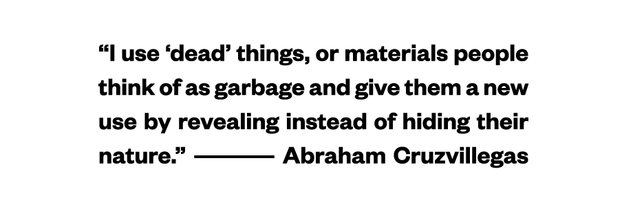 “I’m not an ecologist, but I like the idea of recycling in terms of specific needs,” says Abraham Cruzvillegas, whose series of found-object assemblages shares its name with a DIY building process in the Mexico City neighborhood of his youth. Autoconstrucción is “about scarcity and solutions, ingenuity, and how you can conceive a philosophy of life—that you can make things out of nothing.” More