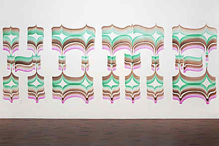 Inspired by Asian calligraphy and cowboy lettering, as well as his own history in graffiti, Amsterdam-based artist Job Wouters recently created a hand-painted mural, Home, in the Walker lobby. “A museum can be so much more than a place where some well-lit pieces hang and you feel scared and not at ease,” he said, explaining the title. “It’s very important to feel safe and comfortable at a museum.” More