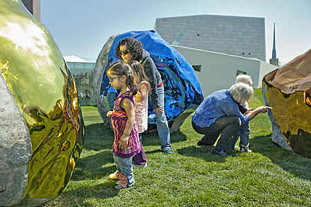 Created by adhering shimmering stainless-steel skins to the surfaces of four 400-million-year-old stones, Jim Hodges sculptural boulders capture and cast sunlight, creating an effect that is both monumental and airy. More