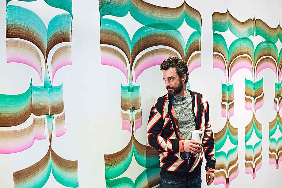 “Culturally, I’m a cold-hearted colonialist,” says Andy Messerschmidt, whose work borrows ideas from world religions, from Buddhist mandalas to Indonesian shamanistic rituals to American holidays, in his art. The tendency is on display in his new Walker commission, which he says explores the “compression of loaded symbols of divinity and how they work in moire to create a meta-symbol of the divine.” More