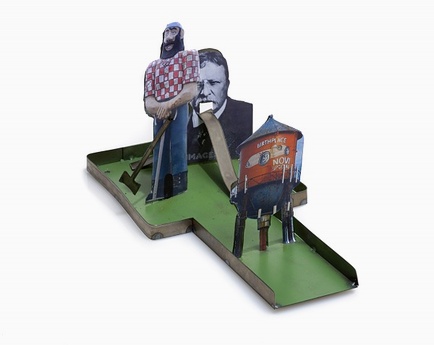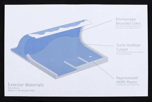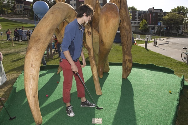 Alchemy Architects of St. Paul created Water Hazard, which employs dozens of dangling water bottles as “an observation of the less-than-ecological practice of bottling and shipping drinking water.” Sculptor Zoran Mojsilov cut a groove into the branches of storm-damaged trees, culled from the Pig’s Eye landfill, to serve as a track for the ball. Maura Rockcastle, a former member of the Walker’s Teen Arts Council, teamed with Regan Golden to build a hilly landscape pocked with mounds that appear as inverted holes. Kevin Kane collaborated with his students to create a rainwater garden and a hillside of pop-bottle bottoms. You can sink a ball into the mouth of Theodore Roosevelt—if you can maneuver past a 12-foot Paul Bunyon—created by artist Andrew MacGuffie. The Big Kahuna, by Michael Keenan, is a huge, single-breaking wave covered with recycled glass. The hole designed by Ed Hernandez plays like Pachinko, a Japanese version of pinball.