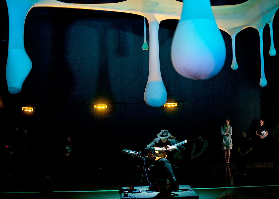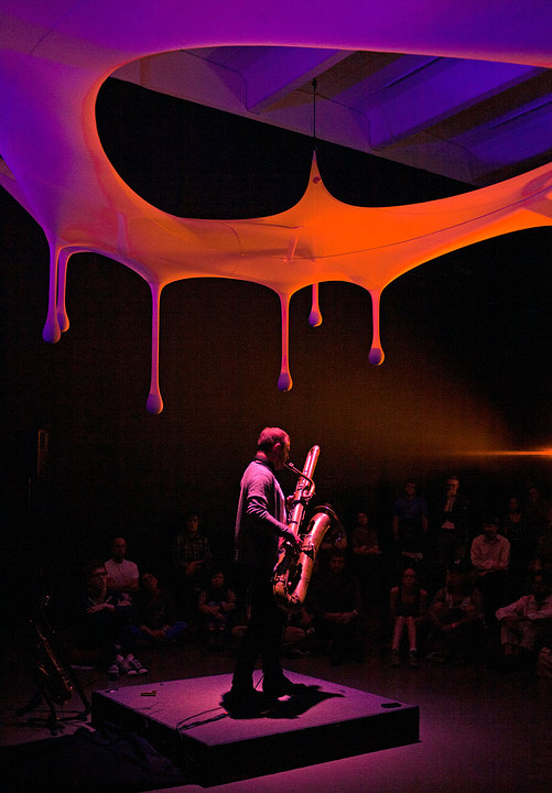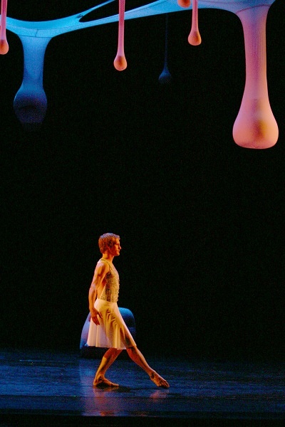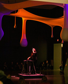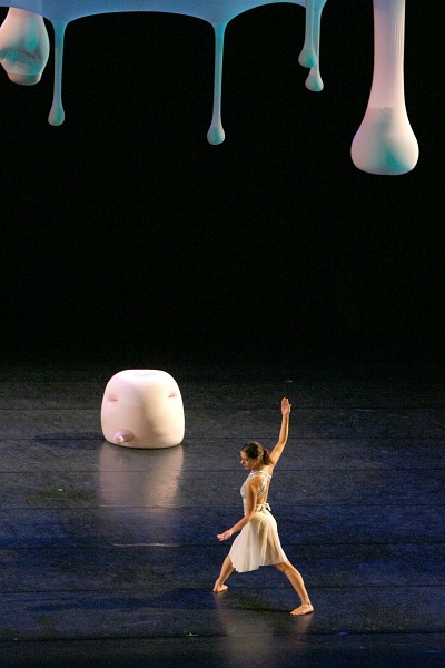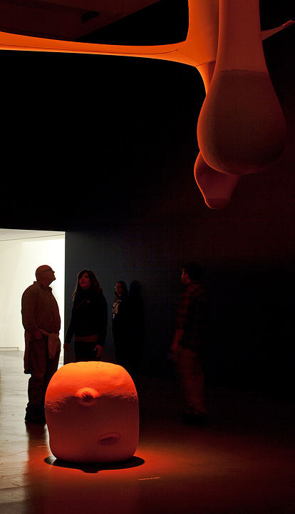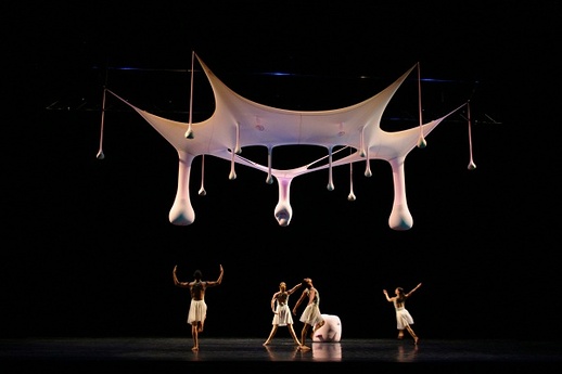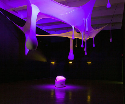 Rio de Janeiro–based Ernesto Neto is a leading figure in the international contemporary art scene, known for large-scale, abstract sculptural environments that are influenced by the human body and other living organisms. Neto created otheranimal, a monumental installation of suspended biomorphic forms above the dancers onstage, for Cunningham’s Views on Stage, which premiered at the Edinburgh Festival Theatre in 2004. Made of translucent white fabric, its elements were intended as a kind of blank canvas to be illuminated by colored lights. Visitors experience the work in the Perlman Gallery, whose dramatically high ceilings approximate the fly space of a theater stage, bringing viewers into an otherworldly realm. A video excerpt of a performance of the dance by the Merce Cunningham Dance Company accompanies the exhibition.