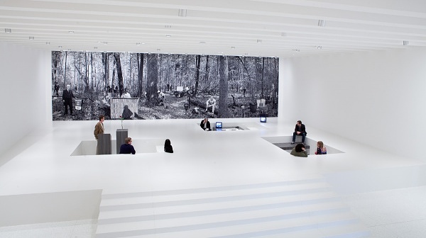 In recent years, Goshka Macuga has become internationally known for using institutional histories as staging grounds for complex proposals. For her first solo museum exhibition in the United States, the London-based Polish artist seizes upon the Walker’s financial underpinnings in the lumber business of its founder, T. B. Walker, and considers the forest as a metaphor for American freedom. She links the history of contemporary art and its museums with the economic and nationalist mythologies of the American landscape, drawing upon a suite of lumber industry publicity photographs that a Walker-family company commissioned from Berenice Abbott in the 1940s.