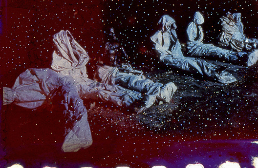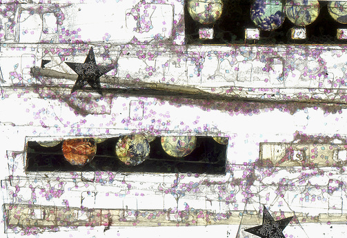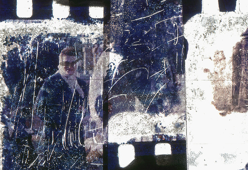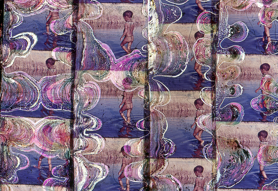 In his recent work with still images, filmmaker Luther Price uses the vivid and mesmerizing techniques he has honed from his decades of deconstructing film. In this case, discarded bits of films are sliced, dyed, and inserted between glass along with dirt, tape, and other detritus. Price’s slide work was included in the recent Whitney Biennial.