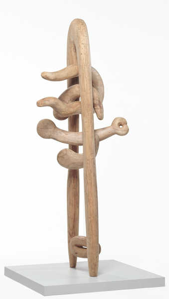 After seven months, Noguchi returned to New York, vowing to dedicate himself exclusively to his art. A series of interlocking sculptures made from marble and slate sheets emerged out of intense work in seclusion, and some of them were included in the Museum of Modern Art’s 1946 exhibition 14 Americans. With evocative titles such as Gregory-Effigy and Kouros, his sculptures from this period maintain a liminal relationship with both figuration and abstraction and give form to the paradoxical notion of transformation in which stability and fragility are in strange coexistence. The easy construction and dismounting of these formally inventive works was also noted by the popular press.2Avatar and Cronos, both from 1947 and in the Walker Art Center collection, were made during this important period of transition and maturation in the sculptor’s life and career. Crafted from pink Georgia marble and later cast in bronze, Avatar employs the same principle of construction as other interlocking sculptures. The joints carved into its compositional planes allow them to be quickly assembled into a whole. Cronos, carved out of balsa wood, an especially light material, consists of a set of rather turgid parts shaped like a boomerang, a bone, and an orb, which intersect, overlap, and penetrate one another, all suspended on a large central horseshoe-shaped support. Describing this work christened with the name of Zeus’ father in Greek mythology, Noguchi wrote, “The image was that of the falling tears, or the limbs, of his sons devoured by the Titan.”3 The biomorphism of both works clearly links the new phase in Noguchi’s art to Surrealism, which had been brought to New York by mostly French émigré artists. The ambiguous and richly suggestive curves, punctuations, and protrusions invite bodily and psychoanalytic readings, also highly relevant to Surrealist art.