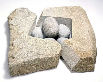 Two works from this later period in the Walker collection, Mortality (1959) and Shodo Hanging (1961), show another stylistic turn taken by the artist. The formal ambiguity of the earlier biomorphic sculptures yields to a more restrained and austere balance, in which constancy and movement are suggested in vertical lines and masses. After establishing a studio in Shikoku in 1966, Noguchi split his time between New York and Japan for the next two decades.
