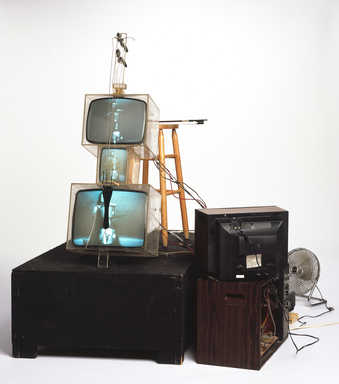 Performance, music, video, and sculpture come together seamlessly in the objects Paik made for Charlotte Moorman, the cellist who became his chief collaborator after 1964. Two key works, TV Bra for Living Sculpture (1969) and TV Cello (1971), are in the Walker Art Center’s collection. The former is an ungainly assemblage of two small picture tubes inside plexiglass cases, which was held on Moorman’s body by an arrangement of clear plastic straps. The images on the monitors could be broadcast television, videotape, or closed-circuit views of the audience; at times the pictures were changed, modulated, and regenerated by the sounds produced by Moorman’s cello as she played.3TV Cello is a stack of three picture tubes, also inside plexiglass boxes, that mimics the shape of a cello. Paik fitted it with three strings and tuning pegs on a plexiglass neck; like TV Bra, its images changed with the performer’s actions.