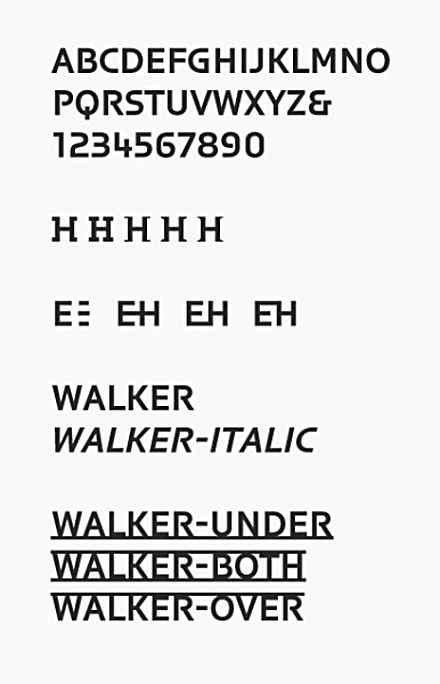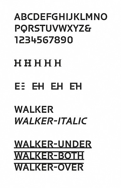 The resulting design, entitled Walker, is a variable typeface whose ultimate look and feel is determined by the designer. Walker is intended for headline purposes and thus exists as an all caps alphabet. In its base form it is a bold sans serif, a style that provides an important link to the institution’s previous typographic palettes. Describing its basic structure, Carter states, “I think of [it] rather like store window mannequins with good bone structure on which to hang many different kinds of clothing.”[2] What distinguishes Walker from any other font are its “snap-on” serifs. By using various computer keystroke commands, the designer can choose among five different types of serifs to attach to any character. In addition, horizontal rules can be placed above and below letters to underline and/or “overline” text—a feature, like a clothesline, from which letters can be hung.[3] To realize the technical innovation of the snap-on serifs, Carter employed a strategy similar to one he developed for Devanagari, a typeface used for Hindi text that allows dependent vowels to be typeset in the correct location of a letterform with simple keystrokes.[4]