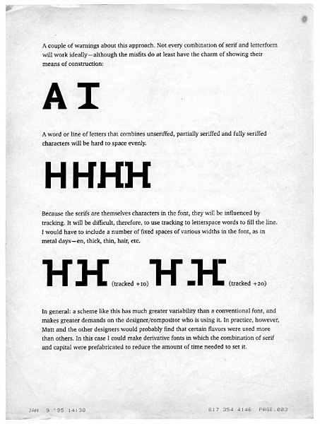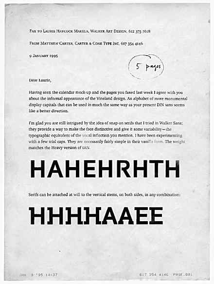 Fax from Matthew Carter to Design Director Laurie Haycock Makela regarding his newly commissioned Walker typeface, 1995