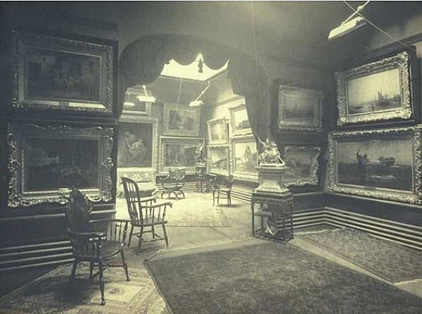 The way that exhibitions originate often plays a determining role in their final execution, and the kernels of inspiration are frequently the most enduring. The idea for Benches & Binoculars began about a year ago with a photograph from an early moment in Walker history. It shows a domestic interior with objects—including a dense array of paintings—stacked floor to ceiling in a salon display style that evokes the history museums of old Europe, with their velvet banquettes and dimly lit interiors. The parlorlike room in this photograph, however, belonged to T. B. Walker, who founded the Walker Art Galleries in 1927 to share with the public his own eclectic variety of ancient objects as well as modern art.