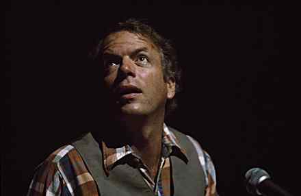 In his plaid shirt, sitting at a table with a glass of water and a microphone, Spalding Gray was an anomaly within downtown New York’s theater scene, which was noted for its messy excess, in-your-face intensity, and ensemble creations. By using language in a performative way, he created a new form of contemporary monologue, an urbane version of front-porch storytelling. He was beloved for his neurotic obsessions and for the fact that he was able to turn a self-deprecating but very literary and keenly observed view of his own life—or carefully chosen moments of it—into complexly layered stories that had universal appeal. Both hilarious and heartbreaking, he had an uncanny ability to connect with people, who came to his shows eager to hear the next chapter of Gray’s life-as-adventure.