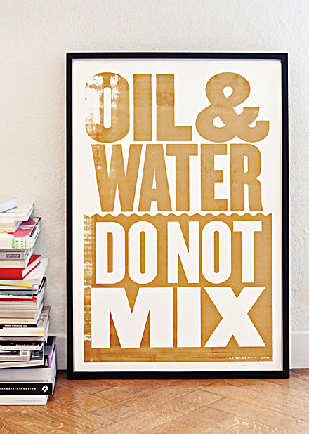 The way that people reach each other through the Internet—the whole social media thing—has completely changed the landscape. When I was at college in the early 1990s, before websites were invented, you kind of made your work, and it only reached a handful of people. Whereas now, with the Oil & Water poster, that went online and just was shared on blogs and, over two or three days, it got such enormous attention.