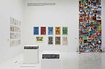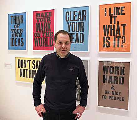 “Work hard and be nice to people.” The line is something of a mission statement for prolific British designer Anthony Burrill. And, not surprisingly, it’s one of his most popular works. Set in Victorian wood type and turned into a poster by a print shop in his hometown of Rye, England, the phrase is part of a series of his simple, upbeat text-based works featured in the Walker exhibition Graphic Design: Now in Production. Situated a few feet from some of the show’s higher-tech works—Dutch collective LUST’s Posterwall for the 21st Century and Jürg Lehni’s robot-assisted drawing machine—Burrill’s work offers a less technological take on graphic design. But, as he readily admits, the Internet plays a huge part in his work: his posters, most notably the piece Oil & Water Do Not Mix—printed not with ink but oil from the Gulf Coast BP oil spill in 2010—have spread across the world as bloggers pass along his quirky, sometimes quizzical, and often encouraging mantras.