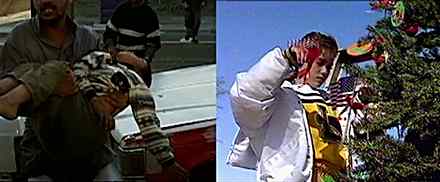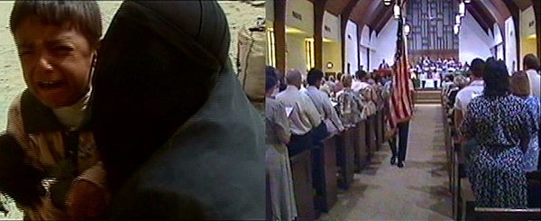 That section came shortly before a series of split-screen clips showing Iraq War scenes: grieving Iraqi mothers and footage of children killed or maimed in the streets alongside clips of Americans waving flags and putting up yellow ribbons for the troops.