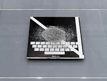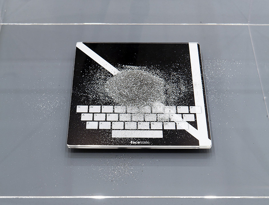 Facestate is a world where, for the government, you are your smartphone. All the components of the installation at the Walker are models of smartphones. Not all of them “represent” something. Plexiglass smartphones and a passport that becomes a password are some of the objects shown. Some of the devices are more abstract than others. One phone is a platform carrying tantalum powder, the rare element mined in the Congo and used in most smartphones. Some other phones are shaped as masks. A mask is a tool important for its capacity to hide identity or present a pseudonym. We are opposed to the idea that everyone should always participate in the Internet under his “real name,” as is Mark Zuckerberg’s mission.