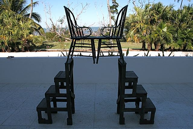 The next day, the dance company and staff took a field trip to Rauschenberg’s estate on Captiva Island. Their bus negotiated a long bridge and a single lane road until it arrived at Rauschenberg’s remote compound, where a picnic supper was laid out on wheeled worktables in the artist’s pristine white studio. Rauschenberg and Cunningham, both wheelchair-bound by this time, sat and chatted while The Guiding Light played on a television situated among stacked jars of pigment. Outside on the lawn, Rauschenberg’s 1981 combine The Ancient Incident (Kabal American Zephyr) was silhouetted against a fish house on stilts and, beyond that, the ocean.