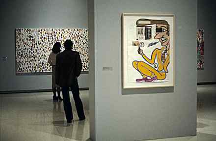 The large-scale Dionysus, measuring 5.5 feet by 7 feet, feels like a direct product of the 1980s—with its underground comics feel, bold colors, and Dick Tracy-like figures—while also having a contemporary resonance: In the age of Occupy Wall Street, when anger over bank bailouts and money in politics is abundant, the image of businessmen crucified side-by-side in suits and ties seems apropos. But he says the personal, not the polemical, guided the work.