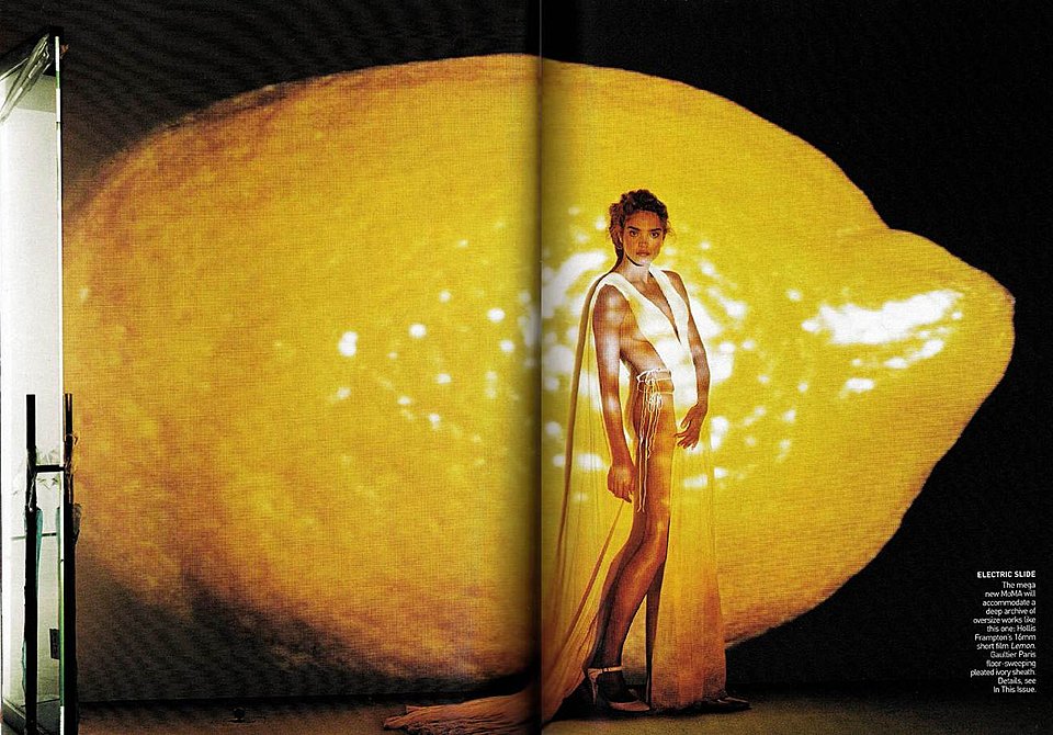 By calling attention to these properties, Frampton ultimately reveals the tension between a two-dimensional surface, as in painting and in cinema, and the illusion of three-dimensional objects. In this way, Lemon critiques the illusory tendencies endemic to both painting and cinema, bringing together the concerns of the art and film worlds in a single work. In its later existence, too, Lemon was not immune from the type of commodification that was more commonly the concern of Pop Art, as this Vogue fashion spread from November 2005 demonstrates.