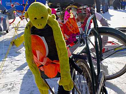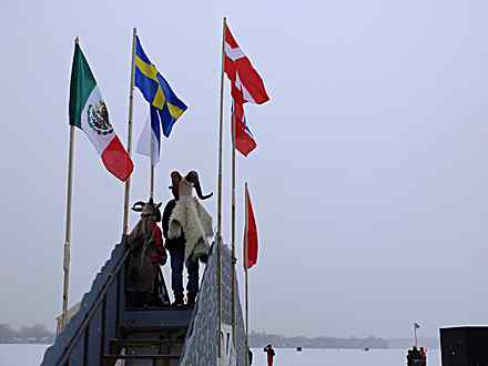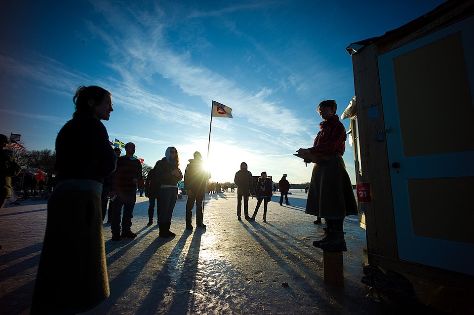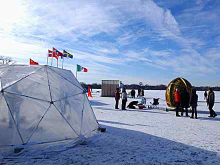The notion of planting flags, a theme Thompson’s been exploring in his recent art, speaks to the emphasis on “place” in the projects: staking a claim, however briefly, on an otherwise inhospitable slab of winter-hard lake. Whether through workshops on making studded bike tires at the ICE-Cycles Shanty or viewing the surrounding area mirrored on the walls of the Reflection Shanty, projects are testaments to place, both in their literal response to the surroundings or in the example of the hardy types who creatively choose to address winter on their own terms.