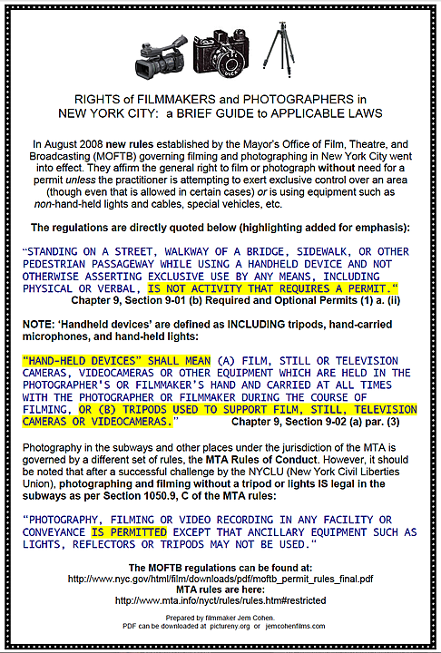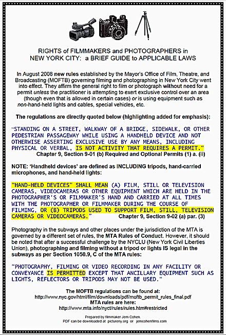 The fact is, the police may not like it, they may still try to shut it down, they may not even know what the new regulations are, but the law is on our side in regards to that, and they don’t really have any choice. When a cop is threatening you to stop shooting, that’s one reality that you have to deal with, but in terms of what the regulations are in this city, we have rights that are not to be denied. I will say I have not seen, in regard to Occupy, much in the way of police trying to stop documentation, except in the sense that, when they shut down the park, for example, they basically tried to shut out all of the press, period. It wasn’t just isolated incidents of people with cameras. They basically tried to make it so that nobody could report on that event. A lot of the arrests have involved members of the press, and it’s completely outrageous that they’ve been trying to do that. But it’s one of those things that, on the street, you have to know what your rights are and insist on them, and that’s really the bottom line there.