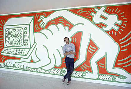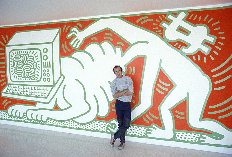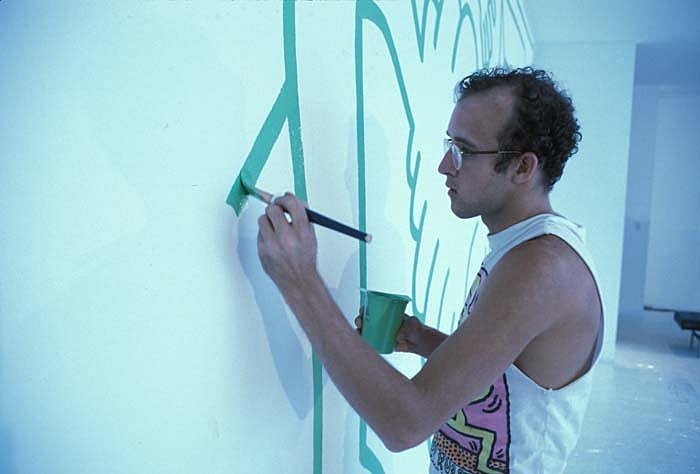 Keith Haring in front of his mural, Walker Art Center, 1984