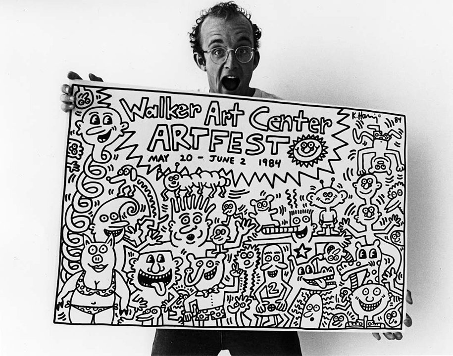 Keith Haring poses with his poster for Artfest, a two-week celebration inaugurating the Walker’s new education spaces