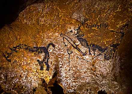 If I had to distill the whole project into one image, it would be the famous “shaft” painting at Lascaux, which shows a stick-figure man with an erection, a bison, and a rhinoceros. It’s a bizarre image. Of the thousands of images in Lascaux, it’s the only one that has a human figure in it, and it seems to depict a scene of great violence. Historians have all kinds of theories about what the painting means, but when I look at it I see a painting of a humanoid who has just inaugurated the greatest mass extinction that the world has ever seen and is sexually excited by that. I sometimes think that the artist who painted that scene meant it as a confession to the future.