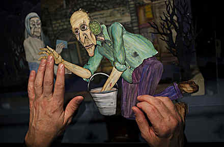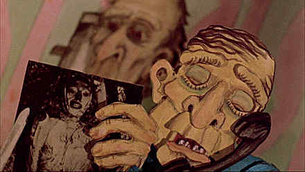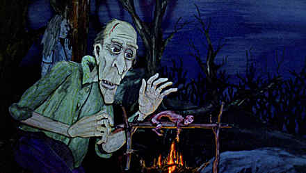 Made up of both stop-motion and hand-drawn animation and shot frame-by-frame on 16mm, Consuming Spirits was a labor-intensive project of handmade aesthetics that Sullivan dove into headfirst. “The idea of having a full color palette was something I really wanted to be able to work with, and that’s what the cutouts provided—that kind of detail and texture,” he recalled. “It was something I had never done before.” The cutouts make up the bulk of the stop-motion action, with movable parts that required minute and time-consuming movements. “The dialogue was logged on little index cards, and so you have to either move the mouth or the little teeth. Some of the characters have replacement mouths and some have hinged mouths. When the actual shooting starts, [we could do] about 300 frames a day—a little more than 10 seconds. If you have multiple characters and multiple camera moves, it will slow down.”