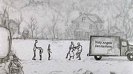 Consuming Spirits is also the result of Sullivan’s wide-ranging tastes in art and wry sense of humor. More than a decade of work translated into a substantial number of years of influences, and you notice many of them flash before your eyes in very subtle ways. (A. O. Scott was astute enough to notice the advertisement in one of the newspaper clippings for “Falconetti’s Barbeque,” a reference to Carl Theodore Dreyer’s masterpiece The Passion of Joan of Arc and its lead actress.) You see traces of the dense work of comic book artist Chris Ware, the rough-around-the-edges drawings of R. Crumb, and the tactile animation of Wendy Tilby, and you hear echoes of the melancholic music associated with alt country in the score. Sullivan does not disagree with these connections, but he is eager to offer up some of his influences and allies—author Alison Bechdel, Dennis Potter’s The Singing Detective, the radio shows of Joe Frank, director James Whale, and filmmaker John Cassavetes, who Sullivan cites as “an enormous influence”: “In [Cassavetes’s] films, there’s always a terrible party you’re at for too long. He wants you to feel that discomfort, that pain.” The bittersweet release from that pain was something Cassavetes was concerned about then, and something Sullivan is concerned about in Consuming Spirits.
