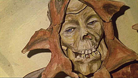 When I asked Sullivan about the initial seeds for his film, he cited the image of the shaman as a visual starting point, specifically referencing a body exhumed from the doomed Franklin Expedition that was lost on its voyage across the Arctic in mid-1800s. The graves of some of the men were dug up in the 1980s to help solve the mystery of the crew who all died due to some combination of scurvy, lead poisoning, and madness. The body of stoker John Torrington, the first to perish on the journey, was extremely well preserved for 138 years by the tundra’s permafrost, his face set with a haunting look of resignation. Sullivan had seen this image and it resonated with him. “It’s so arresting; it’s even sneaking into my new film.” While he has taken great care to retain the appearance of Torrington’s corpse, he has creatively transformed the face into an archeological display similar to one he had seen in Chicago, where he now lives: “There was a shaman from an exhibit in the Field Museum, and the description is very much like what ended up in the film. This idea that a shaman is perhaps a romantic description of an alcoholic was also a starting point.”