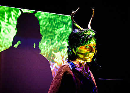That more prosaic tale of the boat trip is interspliced with live performances of kind of wildly fictional characters that are portrayed by me. One is a ghost from a hundred and fifty years ago, a Native American who was murdered at Sand Creek in 1864. She was inspired by my reading about the massacre of the native people in this country. Another is from a couple hundred years in the future, visiting the present, and one is from the present, but from outer space. So they have these much wider perspectives on our situation on this planet.