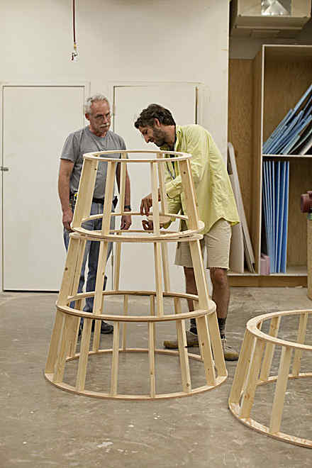 Even more than their dialogical pedagogy, however, what characterizes Futurefarmers’ practice most strongly is its studio-centeredness. What they make is at the heart of what they do. And the value of craft is critical to everything they make, whether it is smashing porcelain toilets into “clay” for new water displacement bricks or the plebeian materials they used to craft the giant megaphone that was a primary outcome of A People Without a Voice Cannot Be Heard. I vividly remember an early scouting trip for these materials with Futurefarmers artists Amy Franceschini and Michael Swaine. Not only was it important to make the simple gesture of shopping at a locally owned hardware store rather than a big box emporium with greater choice and lower prices, but we also spent what seemed like hours discussing the relative merits of ³⁄8-inch dowels and ¼-inch plywood, sail and muslin cloth, and other various and sundry items. Fortunately, afterwards it was equally important to stop at a non-franchise ice cream joint for a cone. And popcorn.