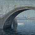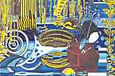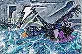 by Rob McBroom December 30, 2005 It�d be fair to say to say that my basic interests haven�t changed dramatically since my childhood. Anyone familiar with my art will notice ongoing themes like G.I. Joe, Greek mythology, Master of the Universe, Pez, Batman &, old 8-bit video games & any other number of nerdly interests. The main theme, though, has been animals. I�m not exactly sure why I like them so much since my contact with them growing up was the occasional outing to the zoo or a weekend camping trip (and that�s only for people who still consider it camping when the park has fire pit, paved trails & A/C hook-ups.) I grew up in the city so the wildlife was pretty much limited to squirrels, rabbits, sparrows or whatever grisly carcass the cat decided to drag back home. Still, my favorite television show as a youngster was on PBS. (was a close second thanks in no small part to the lovely mammal Catherine Bach.) I had wanted to enter the Federal Duck Stamp competition for some time. The trouble was that I could never find much helpful information at my local library about it so the plan was put on hold until I could find out something definitive about it. Finally in 1999, the Internet proved to be the last place I�d ever have to look for duck stamp information. Not only was I able to find information on the contest itself (with its pages & pages of rules and regulations) but also find all the possible images I could ever need on specific species. Some entrants are very particular in their rendering to make sure all anatomical & taxonomic details are absolutely PERFECT & will make special sojourns to Alaska for it. The Department of the Interior had also sent me information for 3-day workshop in Maine just for the Black Scoter to help with my design. I guess it�s lucky for me (or more specifically, my wallet) that I have very little interest in rendering the birds realistically. Along with the surrealist & cartoonish slant, my work uses a lot of logos. For me it�s hard to get away from them since they, or the corporate culture they represent, are so much of how we define ourselves. I don�t necessarily mean that whole idea of evil Fortune 500 corporate culture either. I just mean that unless you�re weaving your own fabric & growing your own food, chances are in some form those things are coming from sort of company. When I use the logos I try not to let my personal feelings about them affect where I place them in a piece, it�s mainly just something that graphically works well. I�d rather not to get too preachy about anything, and let the viewer make their own judgment call about what it means since they�re bringing their own personal experiences to it. An example of this would be in the in the design for the 2005 design of the Canada Goose. In it, the bird farthest to the left has logos for Knuckleheads comedy club, Lake Mead Area Realty, US Lacrosse & a Transformers Decepticon emblem. Now for me 3 of the 4 have at least some personal connection. With Knuckleheads it was that I had a date with someone that I almost cancelled because I got super bad diarrhea from some Burger King onion rings. I ended up going but was in the restroom most of the night. The realty office I remember from a sign while going out to Hoover Dam on Thanksgiving Day in 2003. I had just had an operation 3 weeks earlier & it was one of my first big outings afterwards so it stuck in my mind despite my blissful stupor from the Percocet. The Decepticon emblem goes back to more childhood interests that still worm into my life 20 years later. As for the US Lacrosse logo, on a personal level, it means squat. It has absolutely no personal connection for me whatsoever. That�s OK though because someone else viewing it may make some other correlation with it to his or her own life. Often I get accused of just doing these to make fun of the whole culture that really digs nature art. While there are actually some subversive elements to it, that really isn�t why I do them the way I do. In a sense I find it more truthful to how I experience the ducks in �nature.� Most of the stamp designs, while taxonomically accurate, are probably the most idealized things you could ever see. Everything about their settings is PERFECT & one could expect Jesus Christ himself is parting the skies just for their magical flight. At least for me, this is a pretty far stretch from reality. When I actually see ducks or geese in flight there�s usually some giant billboard or fast food sign in view & if it�s not like that, then they�re a bunch of tiny squawking blobs passing overhead. I do realize there is some happy medium between both settings but I�m just interpreting things as I see them. Where I feel I�m actually being subversive is sneaking things in that are clearly against the contest regulations. One of the guidelines states there may be no lettering or banners of any kind in the layout. To sneak a message in I�d translate works into Morse code & incorporate the dots & dashes into the design. The most blatant example was the 2001 Black Scoter stamp that had the message in the falling drops of rain as the bird flew through a storm. In its entirety, the message is a transcription of a monologue from a pornographic movie where the exceptionally talkative lady bounces back & forth about what�s being done to her & how much she likes it. I had only started entering designs the year before & was ranked dead last. Assuming that the outcome would be the same again, I thought it apt the lighthouse in the background should be from Cape Disappointment in Washington State. It turned out a bit ironic because I was correct about being last (yet again); it also garnered attention from a curator at the Whitney Museum in New York. I plan on making & submitting the new designs each year even though I…