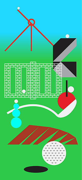 Riffing off the multiple meanings of rock, Rock! Garden by Dysart will require bank shots off colorful, glittery fiberglass rocks that will contain musical instruments (xylophone, tambourine, drum, taut strings). The hole borrows its layout from an iconic Zen rock garden while its aesthetic stems from the flashy finishes of musical instruments. Players will have to unleash their inner rockstar to gain the enlightenment of a birdie.