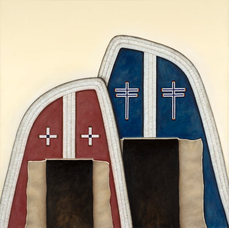 Dyani White Hawk (Sicangu Lakota) is an artist based in Minneapolis. She earned her BFA from the Institute of American Indian Arts (2008) and MFA from the University of Wisconsin-Madison (2011). White Hawk is a recipient of 2017 and 2015 Native Arts and Cultures Foundation Fellowships and the 2014 Joan Mitchell Foundation Painters & Sculptors Grant. She draws from her multicultural background and education to create paintings and mixed-media works that speak to her upbringing as a Lakota woman in an urban American landscape. Her works are in the permanent collections of the Smithsonian National Museum of the American Indian, Minneapolis Institute of Art, IAIA Museum of Contemporary Native Art, and Tweed Museum of Art, as well as other public and private collections.