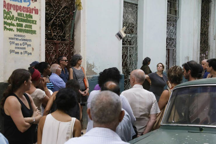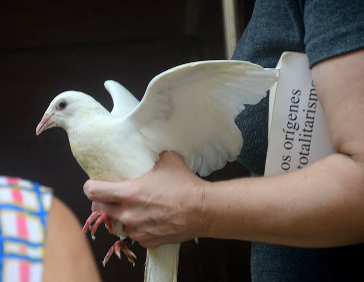 On Sunday afternoon, after the reading of Arendt was completed, Bruguera walked out of her home to the street, holding a white dove in one hand and a copy of The Origins of Totalitarianism in the other, accompanied by a few friends and biennial visitors. She went out despite the menacing presence of rough-looking men all over the street. She walked to the right, toward the first intersection, followed by the group, and then, after we covered some 30 meters, another “performance” took place. As in a Hollywood thriller, three cars appeared, the first one stopping in front of Bruguera. Her two interrogators came out of the vehicle swiftly, the lieutenant colonel wearing her uniform—all others in the cars were undercover, as were the tough guys who surrounded the group. They confronted Bruguera in a dramatic way, the colonel shouting to her. They told her that she could not continue and that they would take her to her mother’s house, which is in a distant neighborhood. The artist talked with them. It was a moving and meaningful image to witness the tall, corpulent woman in uniform and the other interrogator confronting the artist as she held the white dove and the book in her hands. The whole scene looked like a straightforward allegory.
