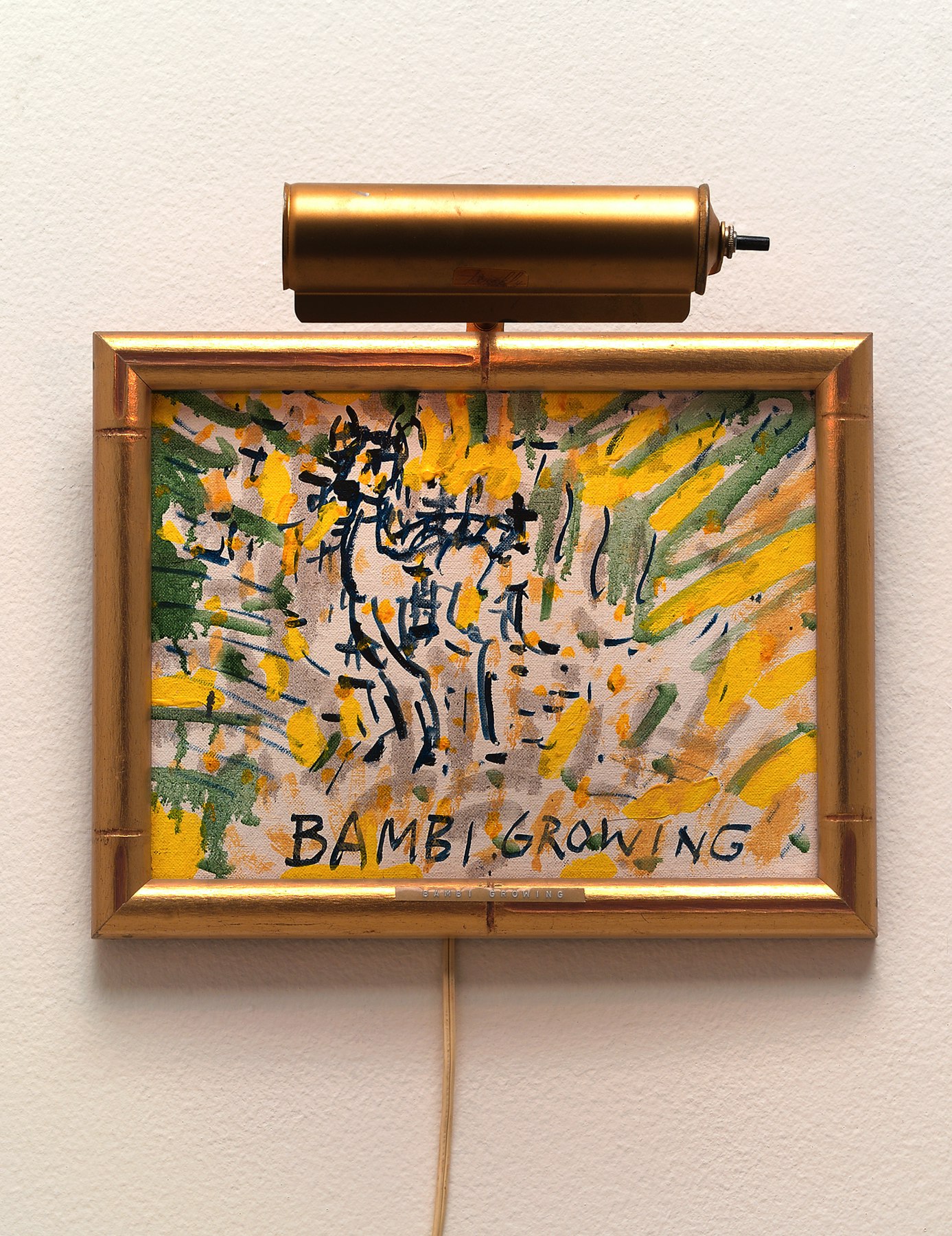 - acrylic on canvas, artist's frame, embossed plastic, picture light