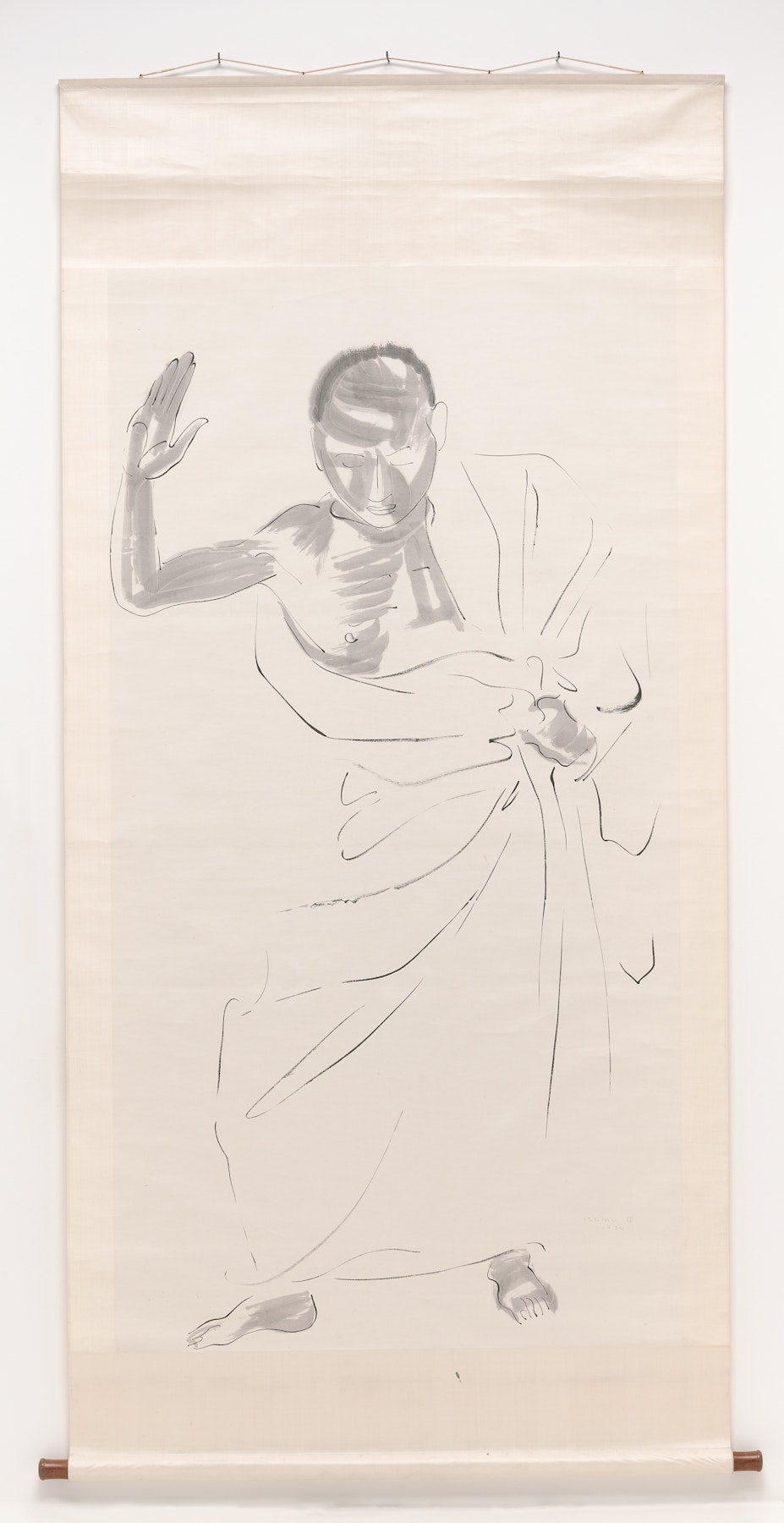 - ink on paper mounted to silk, wood dowel weights