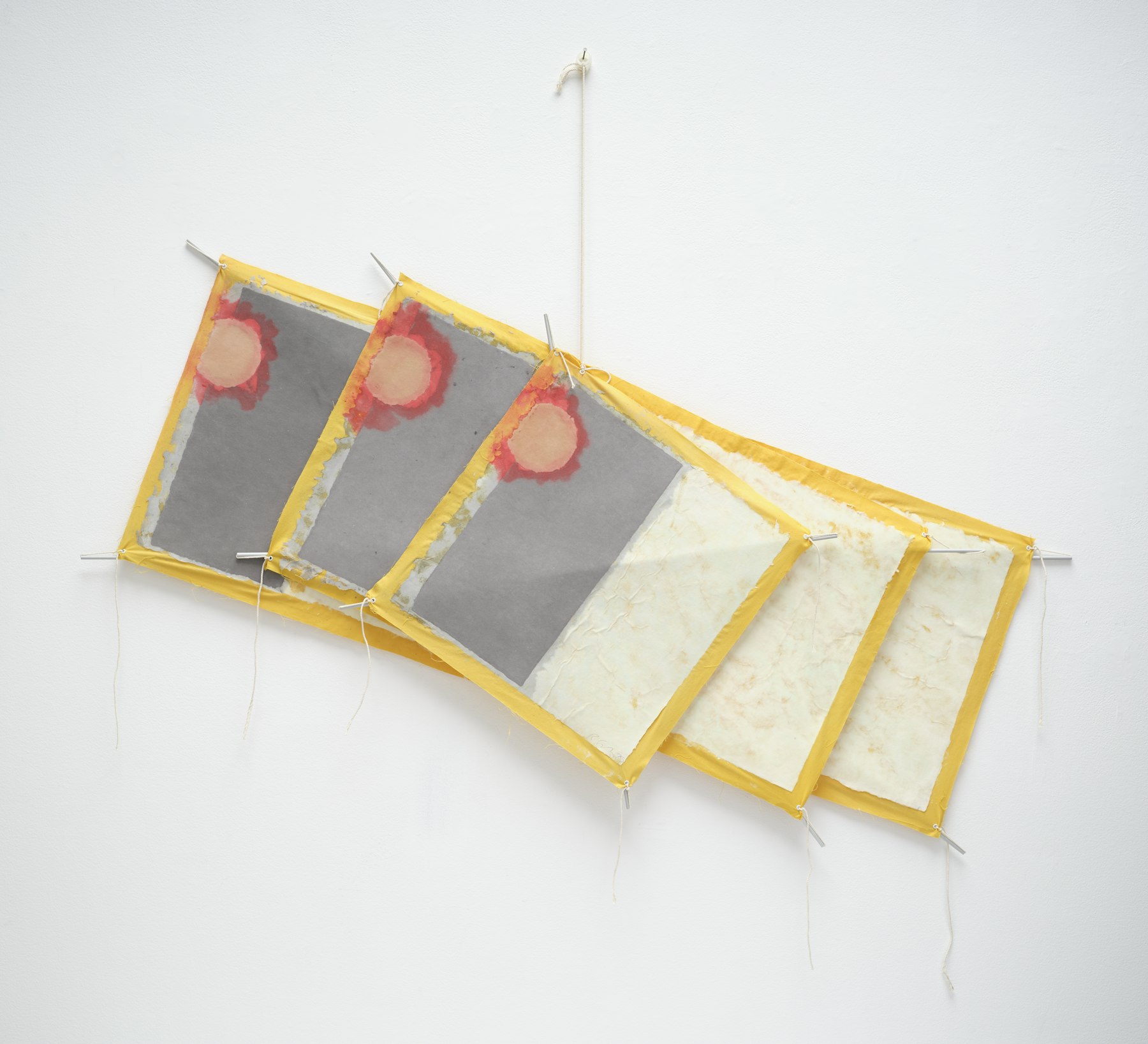 colored, pressed paper pulp; fabric; grommets; string; aluminium tubes