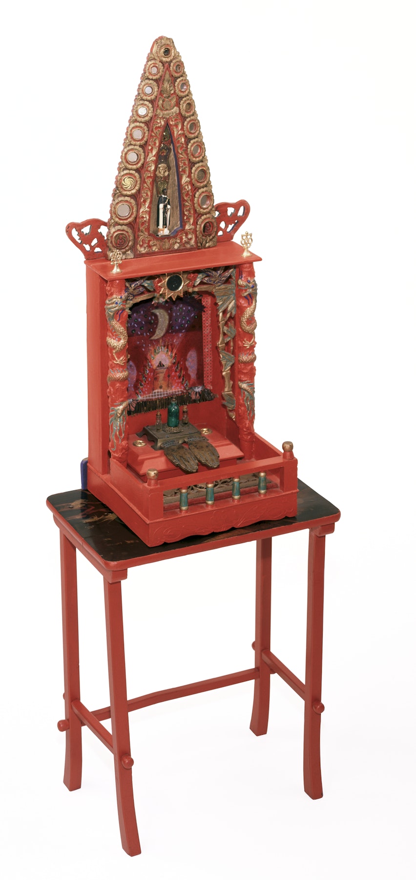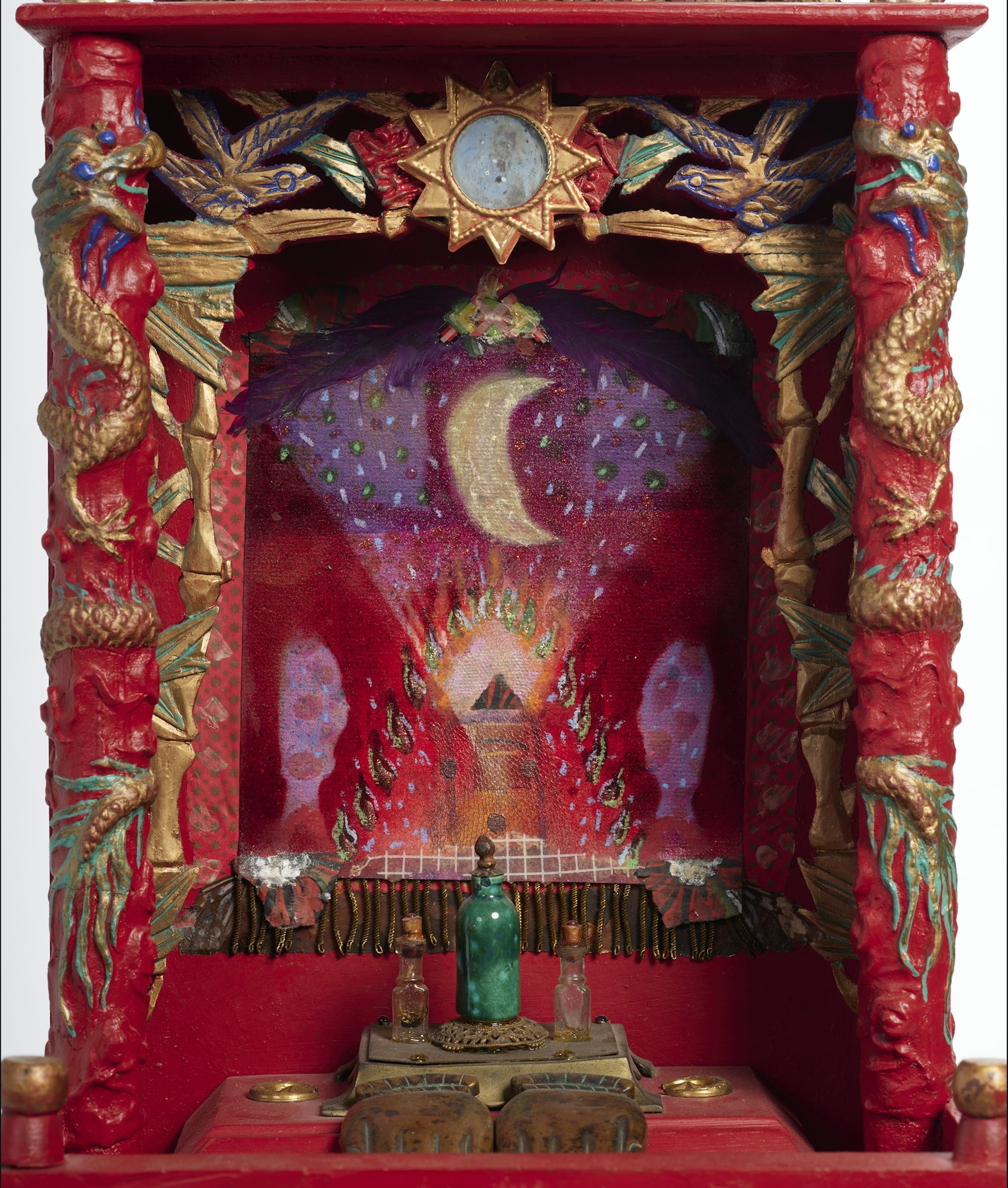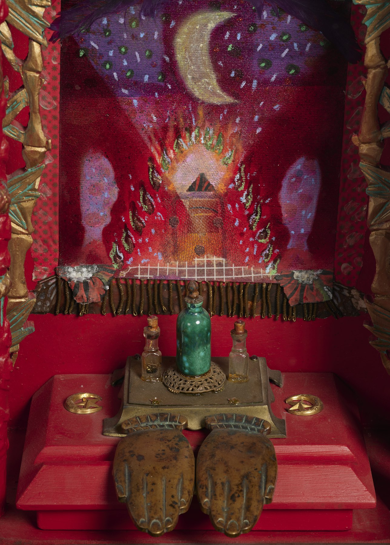 - wood, paint, plastic, mirrors, embroidered fabric, feathers, metal, glass perfume bottles, painted and lacquered wood table