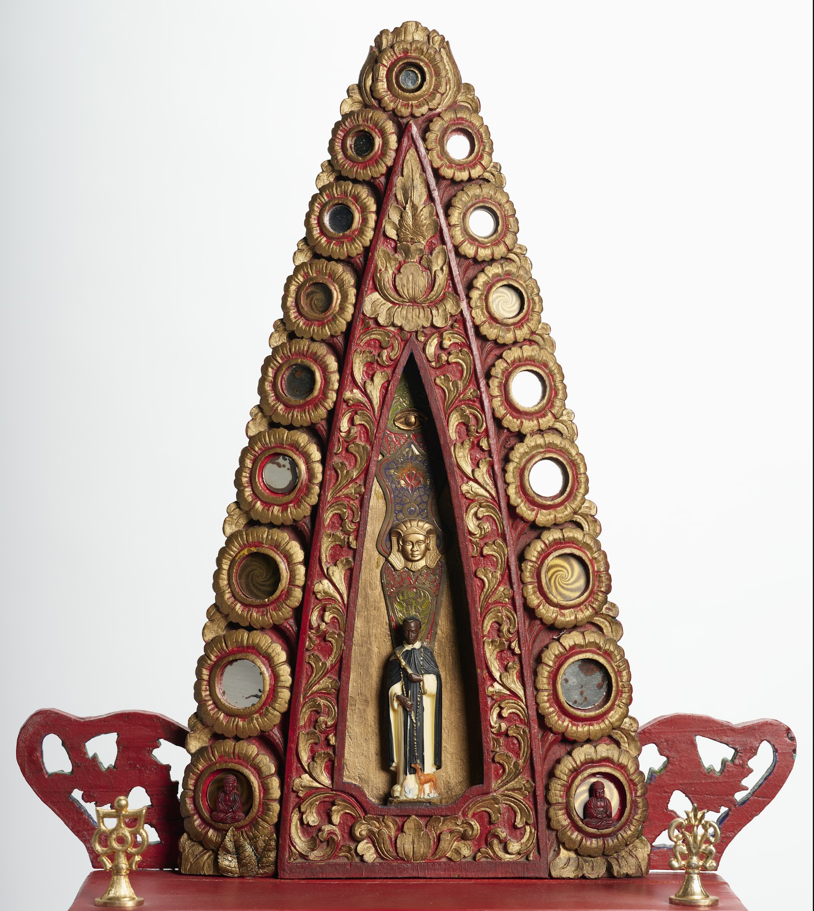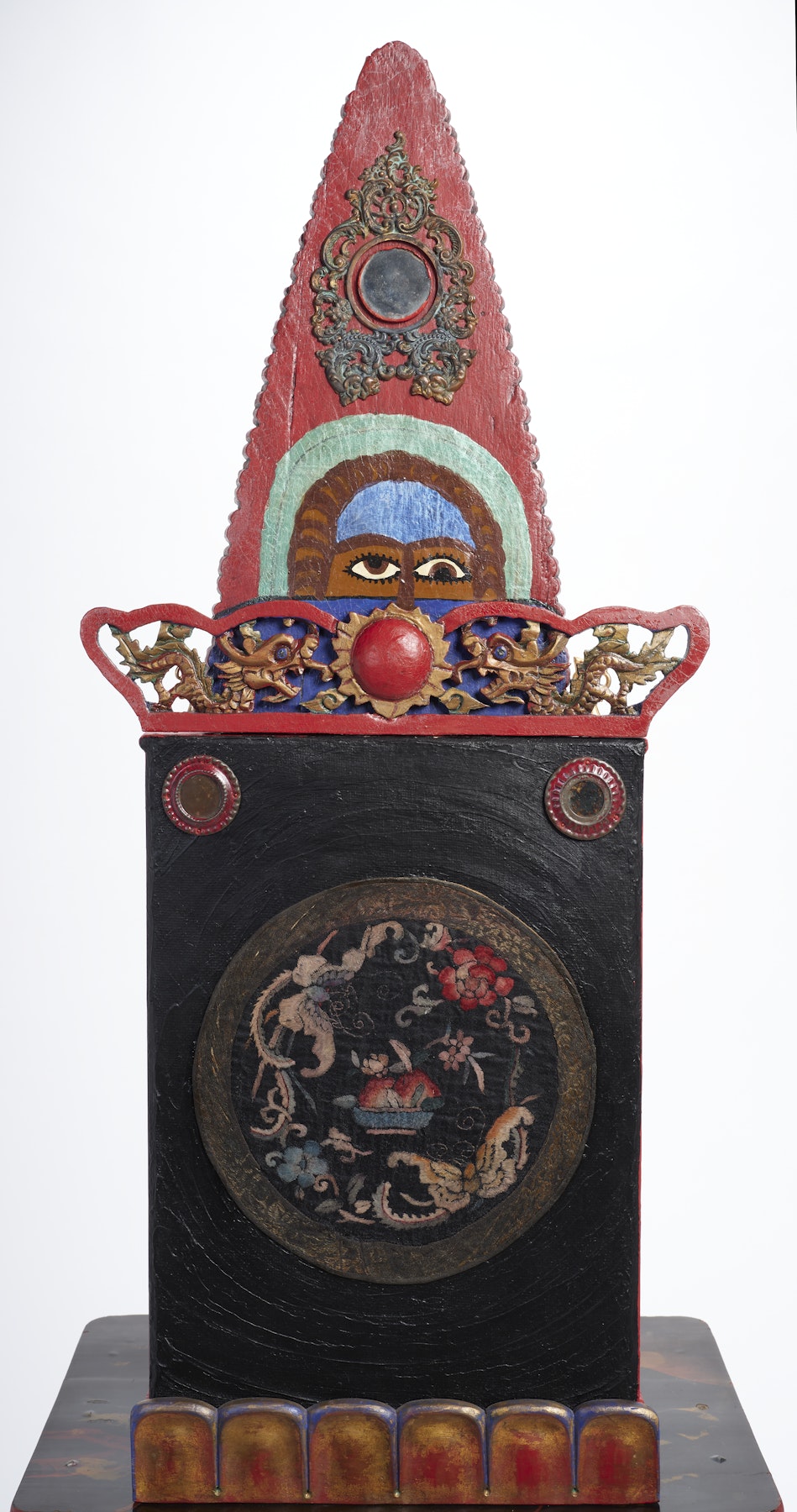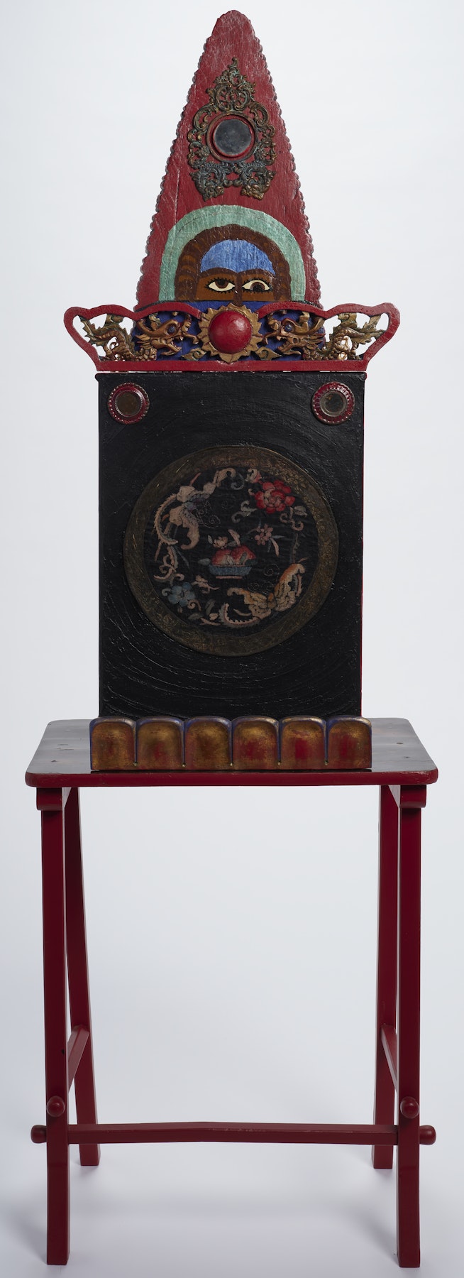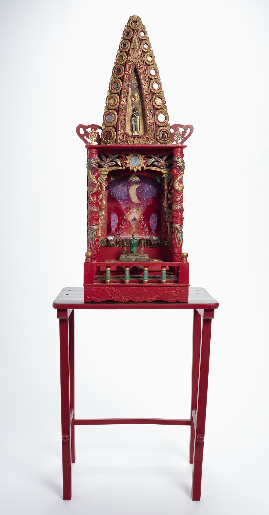- wood, paint, plastic, mirrors, embroidered fabric, feathers, metal, glass perfume bottles, painted and lacquered wood table