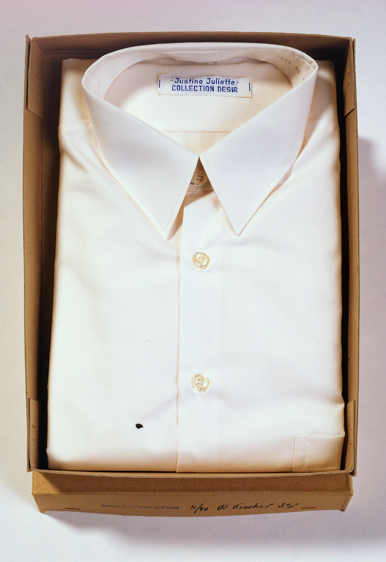 - cotton shirt, plastic buttons, cardboard box, staples, plastic and cardboard collar stay, straight pins, tissue paper, thread