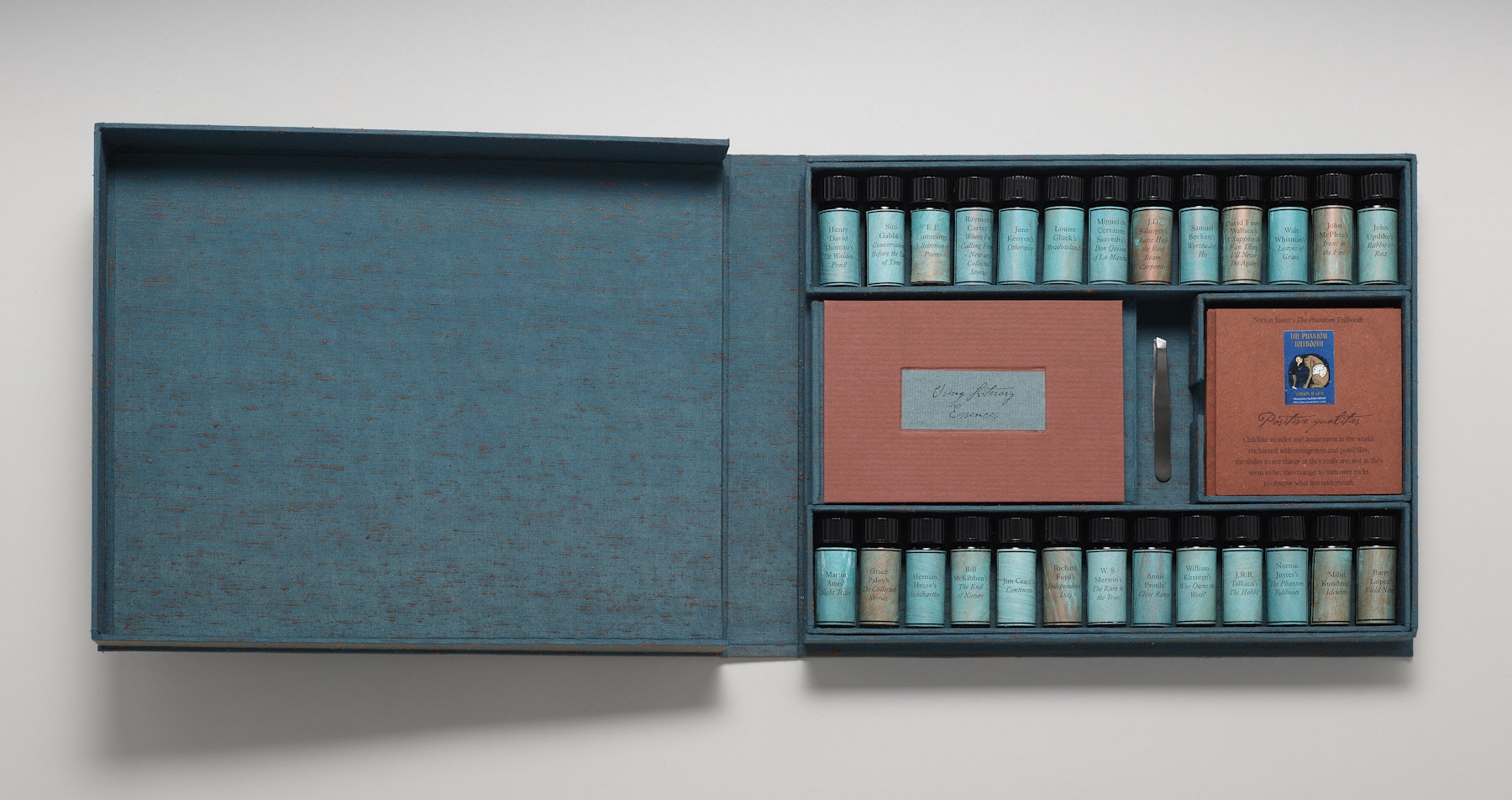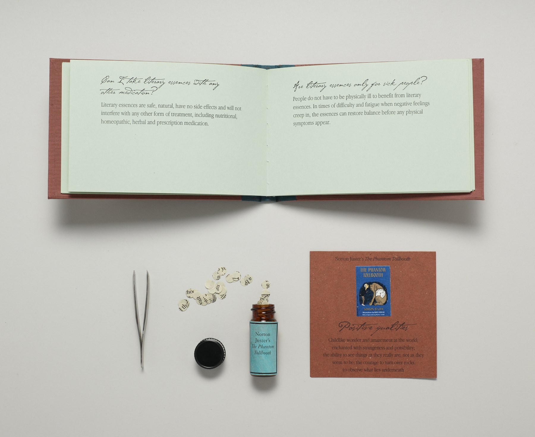 - box, glass vials, tweezers, 26 cards with collage, printed book