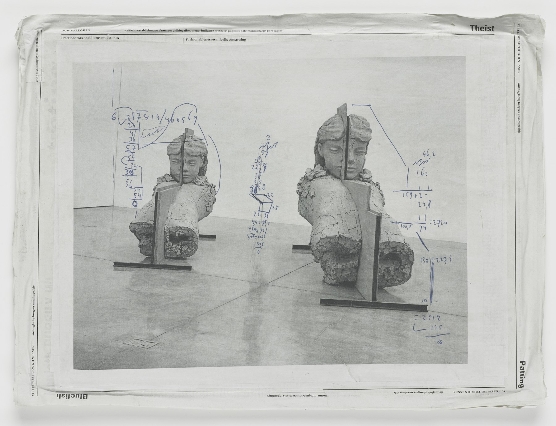 - paper-mache, ink, offset print on paper, acrylic paint on paper, plywood