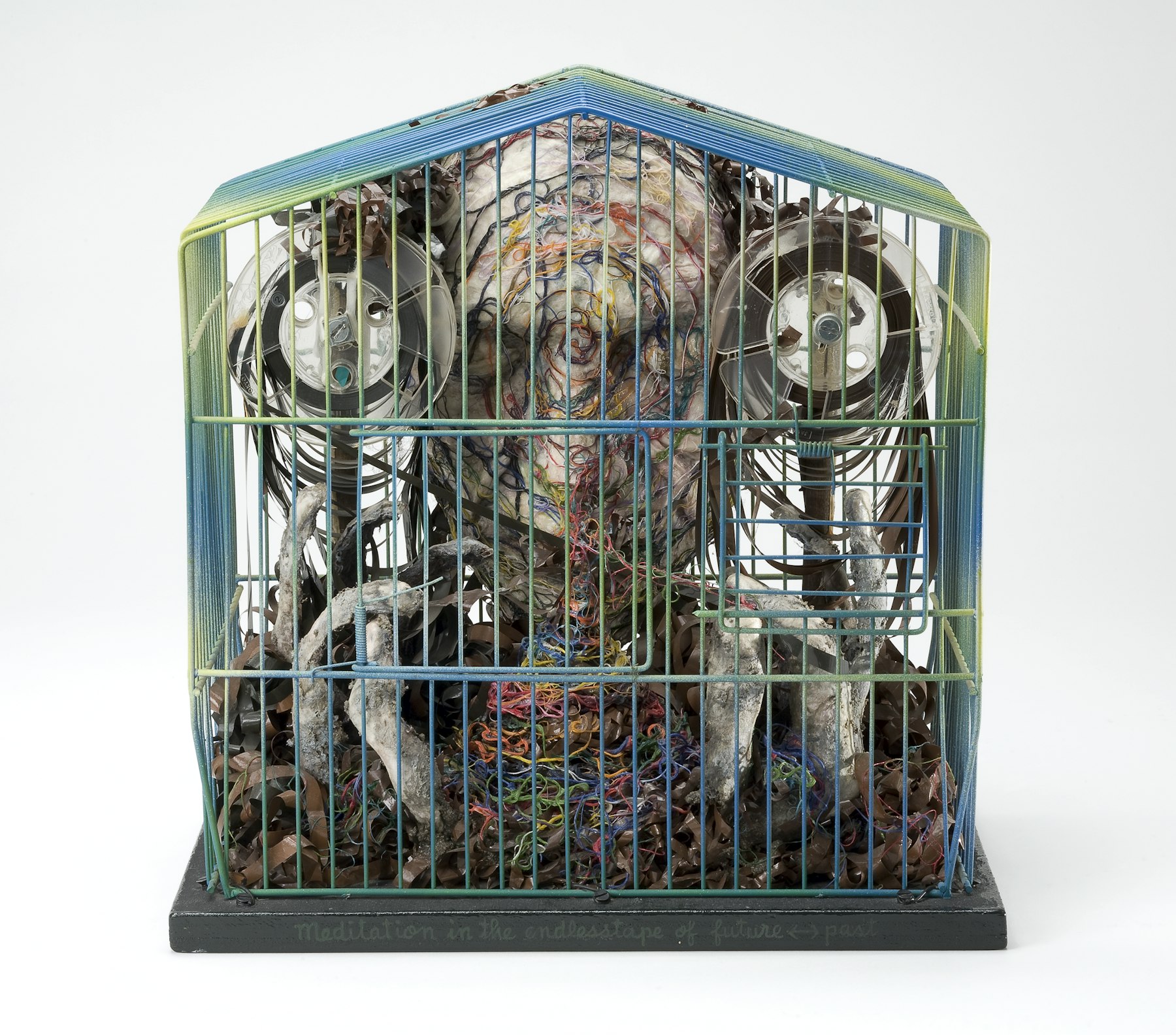 - painted cage, cotton, plastic, polyester, resin, magnetic audiotape, tape cassettes, string, hair, adhesive