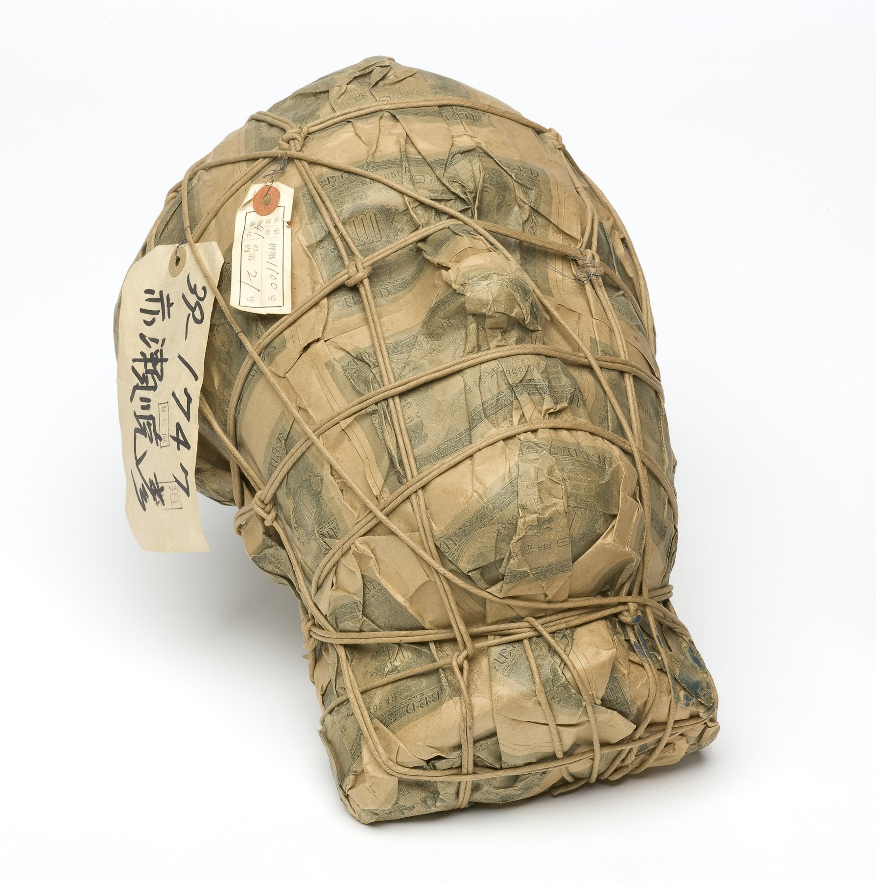 - imitation one-thousand-Yen sheets, plaster mask, string, wire, paper tags
