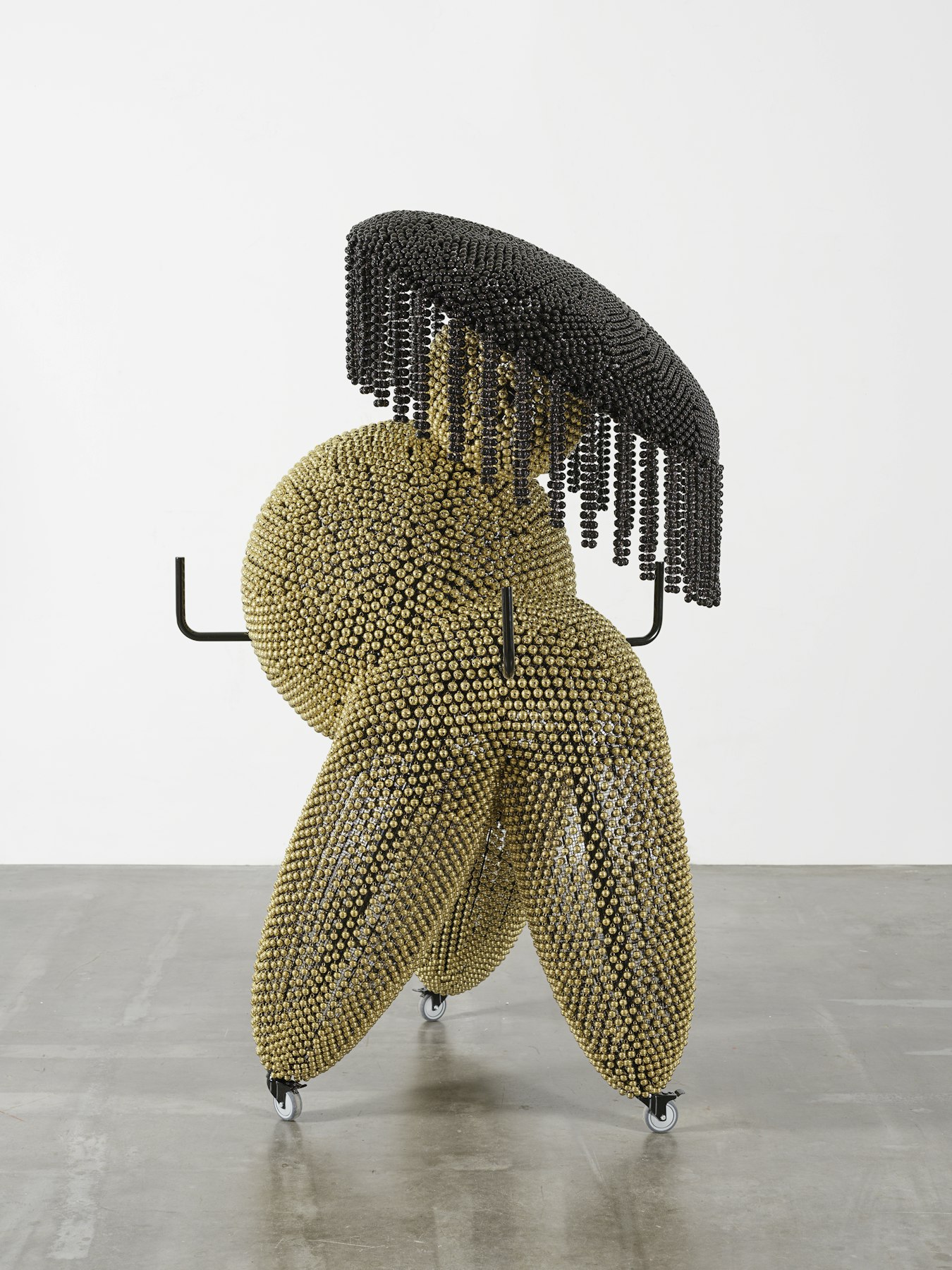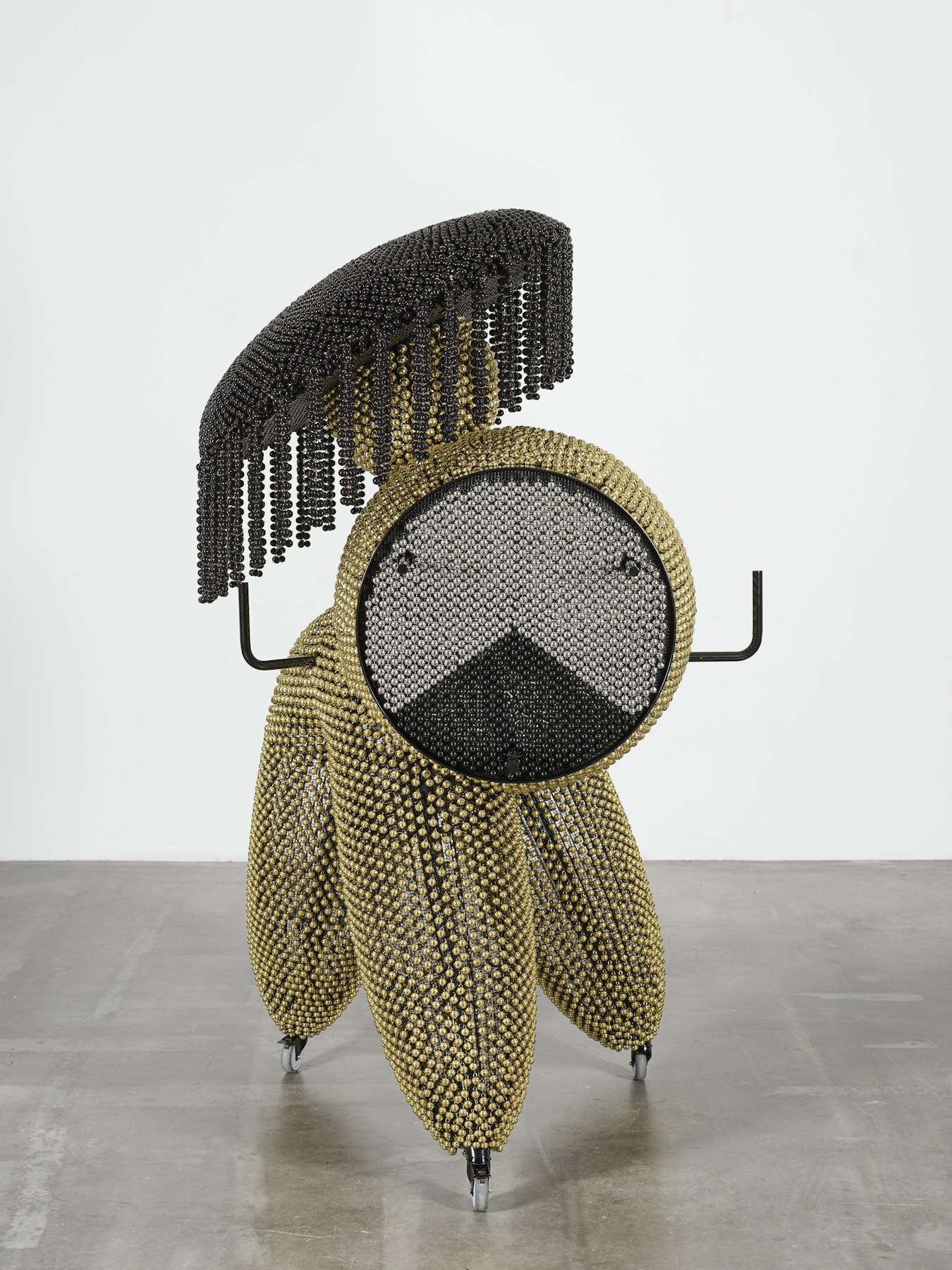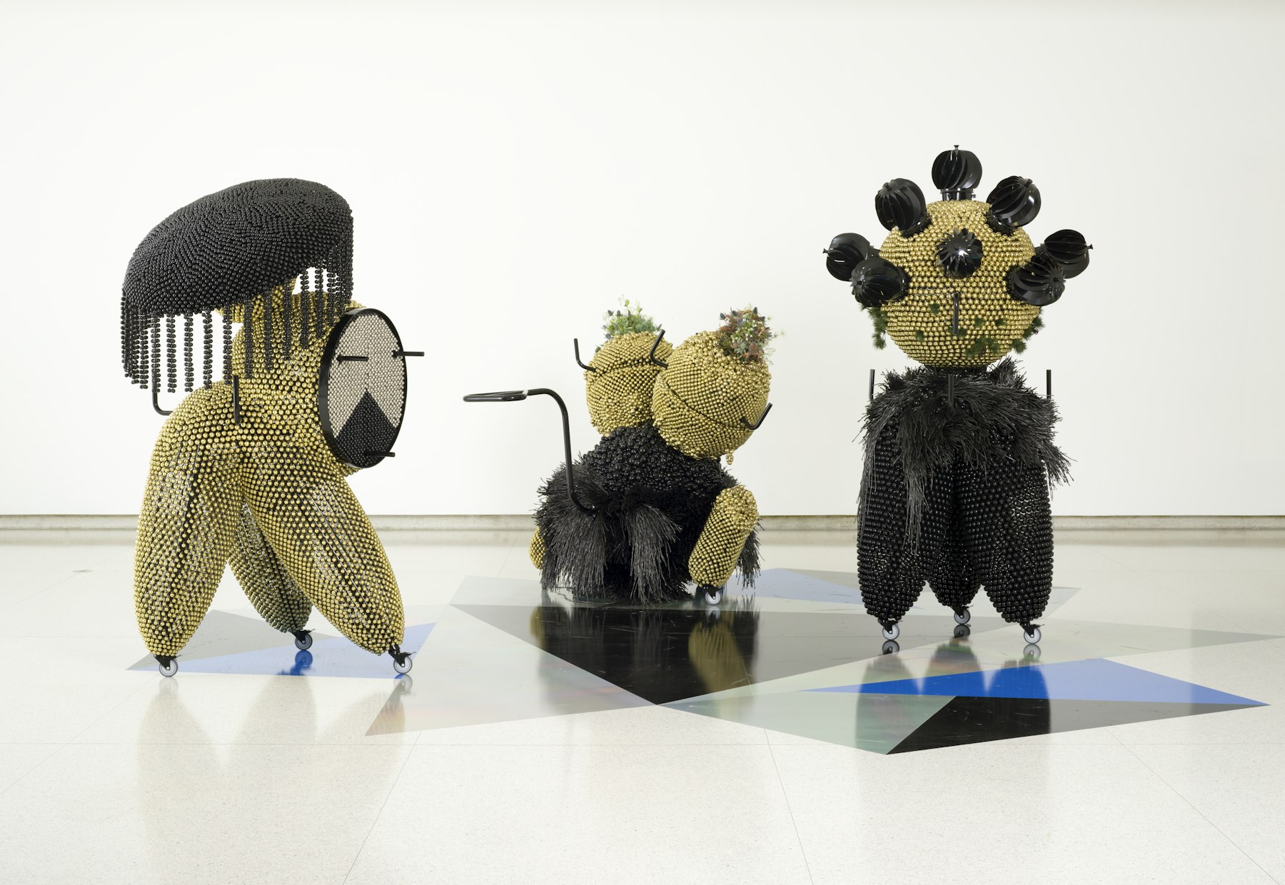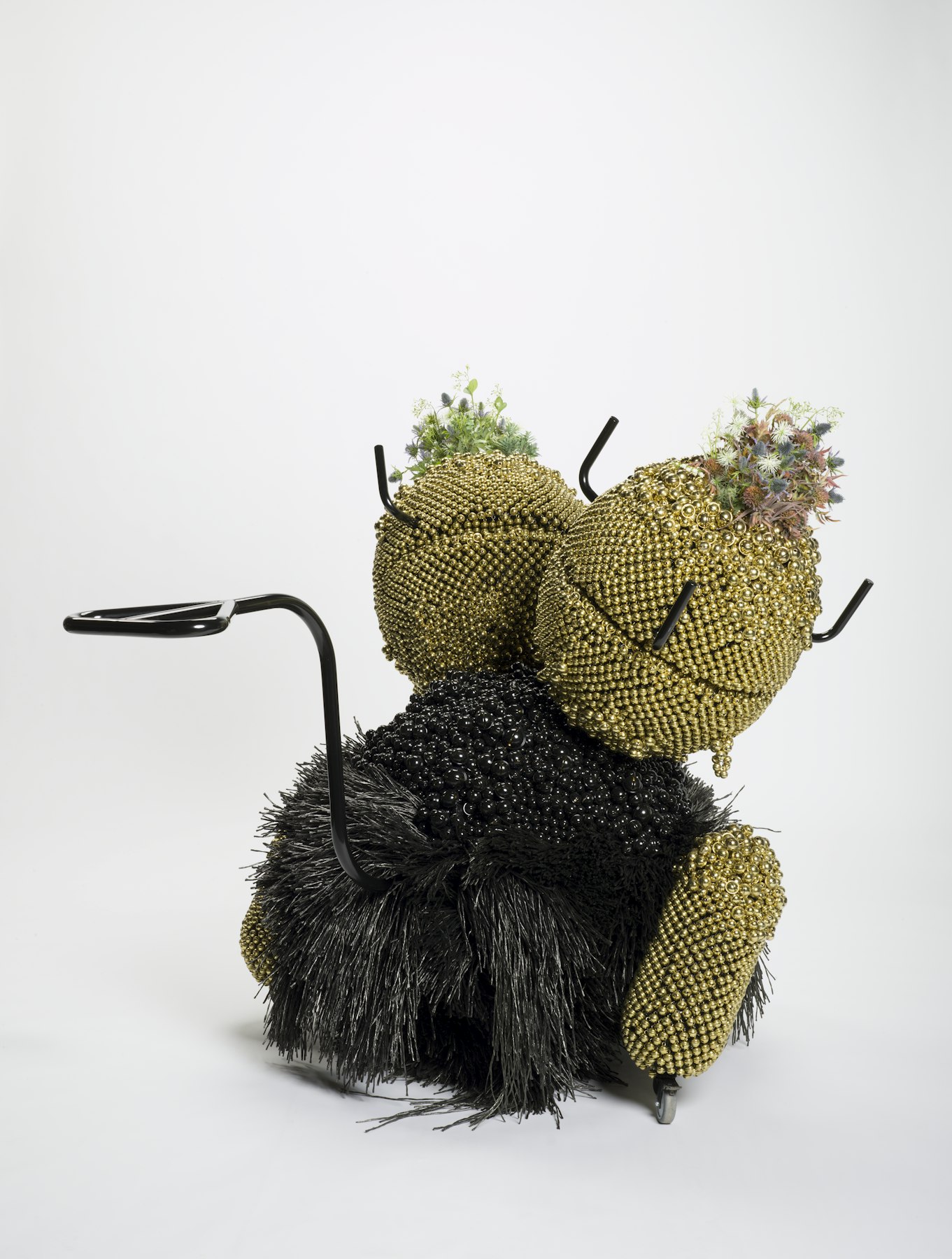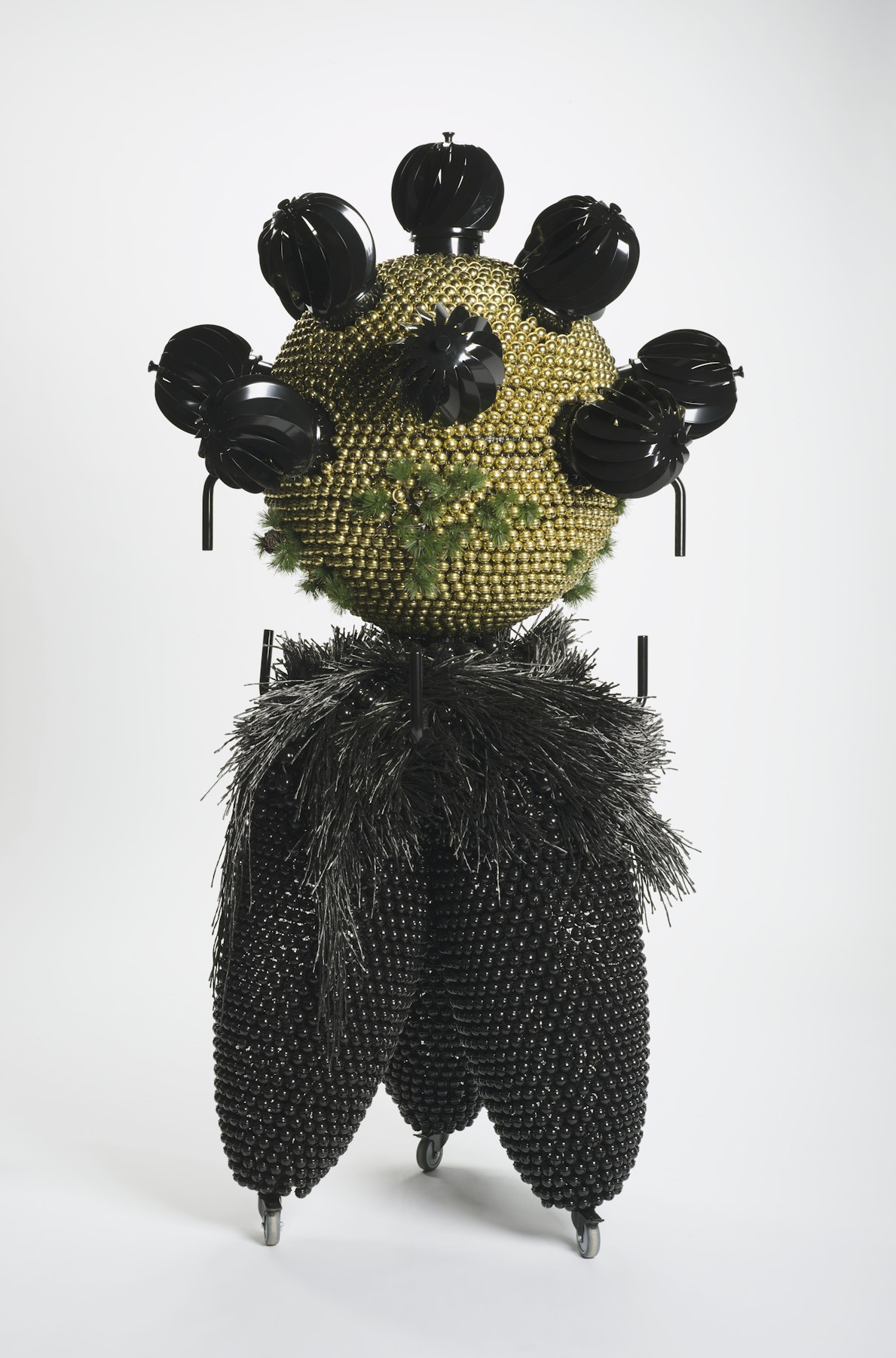 - powder-coated steel and handles, casters, nickel and brass plated bells, metal rings, plastic twine, turbine vents, artificial plants, pine cones, foam